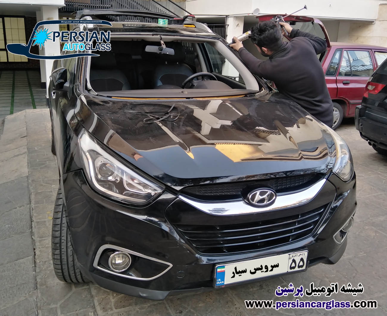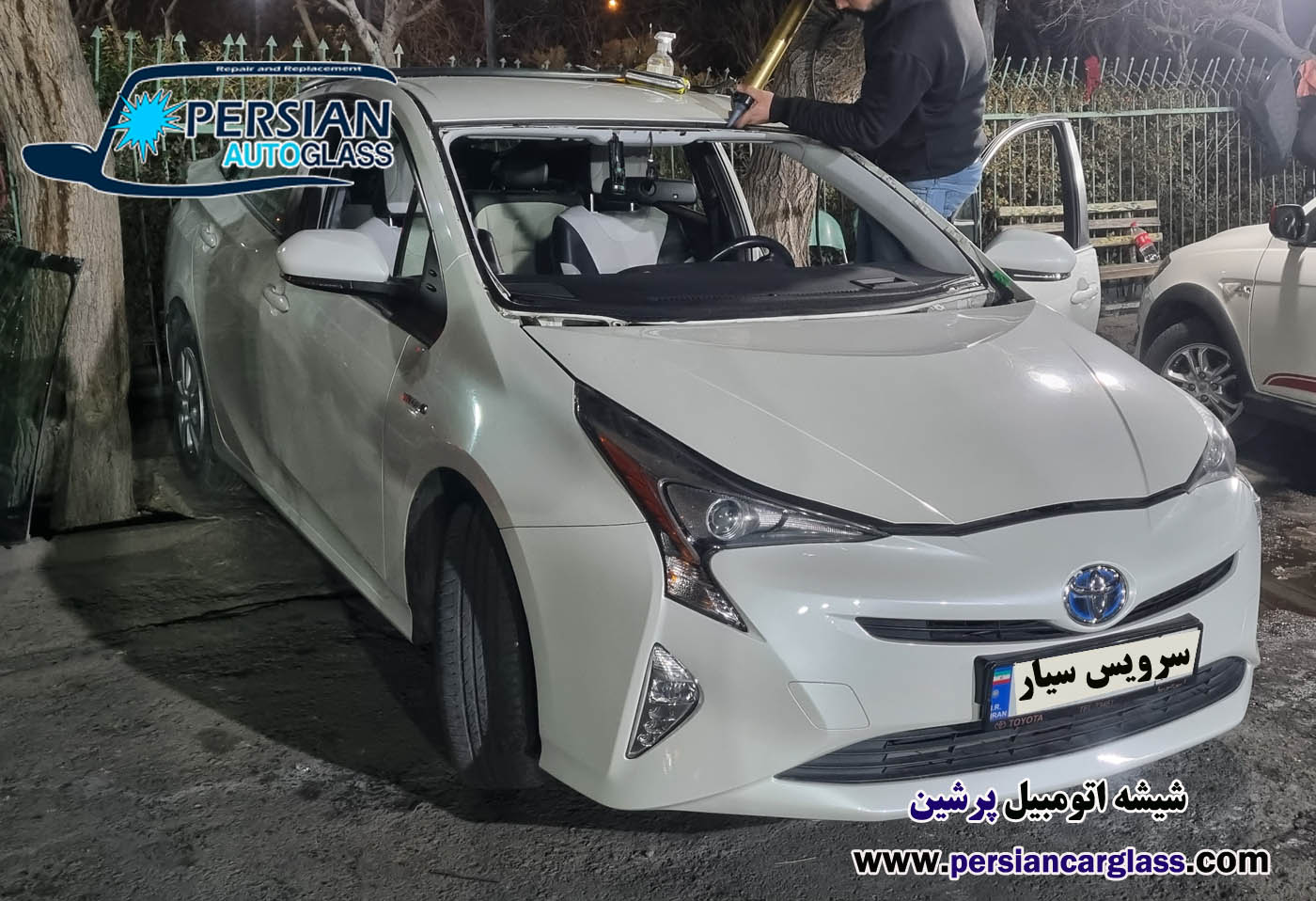 تصویر ذیل نمونه ای از تعویض شیشه خودرو را نشان می دهد که بصورت سیار و سرویس در محل مشتری انجام شده است.